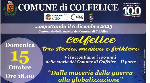 Domenica 15 ottobre, alle ore 18.00, nel piazzale antistante la sede comunale, si terrà il terzo evento del programma “Storia, musica e folklore” predisposto dall’amministrazione comunale di Colfelice .
