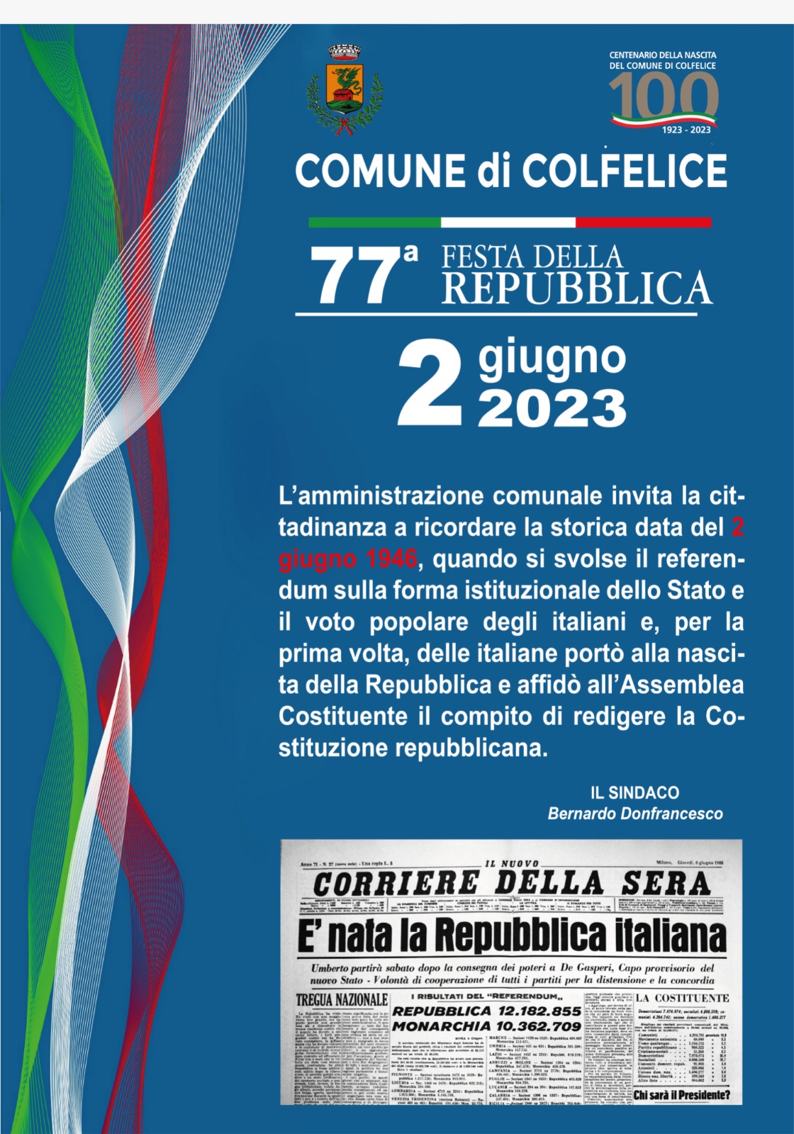 L'Amministrazione comunale invita la cittadinanza a ricordare la storica data del 2 Giugno 1946, quando si svolse il referendum sulla forma istituzionale dello Stato e il voto popolare degli italiani e ,per la prima volta, delle italiane  portò alla nascita della Repubblica .
