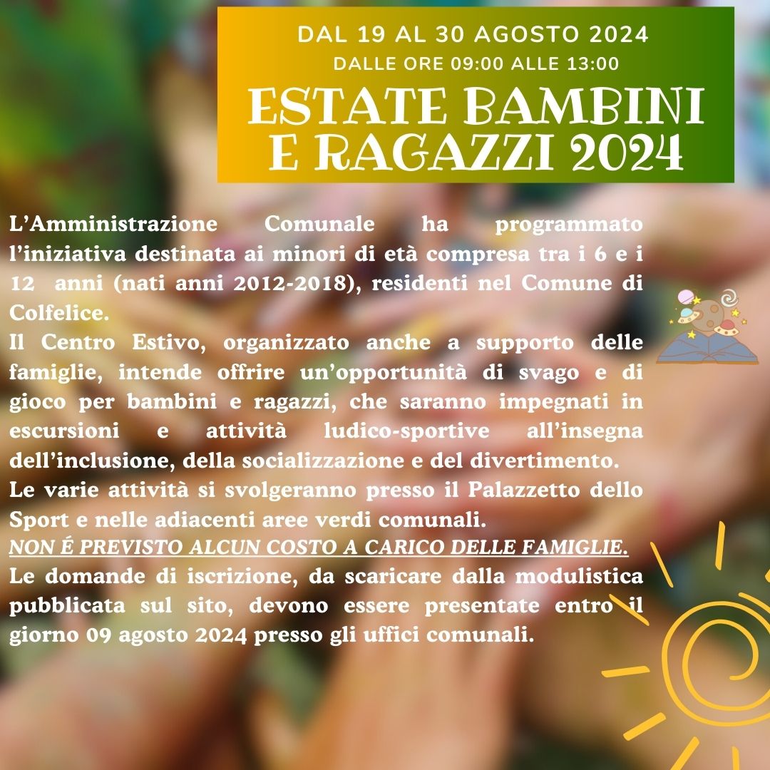 L'Amministrazione Comunale ha programmato l'iniziativa destinata ai minori di età compresa tra i 6 ei 12 anni (nati anni 2012-2018), residenti nel Comune di Colfelice. Il Centro Estivo, organizzato anche a supporto delle famiglie, intende offrire un'opportunità di svago e di gioco per bambini e ragazzi, che saranno impegnati in escursioni e attività ludico-sportive all'insegna dell'inclusione, della socializzazione e del divertimento. Le varie attività si svolgeranno presso il Palazzetto dello Sport e nelle adiacenti aree verdi comunali. NON É PREVISTO ALCUN COSTO A CARICO DELLE FAMIGLIE. Le domande di iscrizione, da scaricare dalla modulistica pubblicata sul sito, devono essere presentate entro il giorno 09 agosto 2024 presso gli uffici comunali.