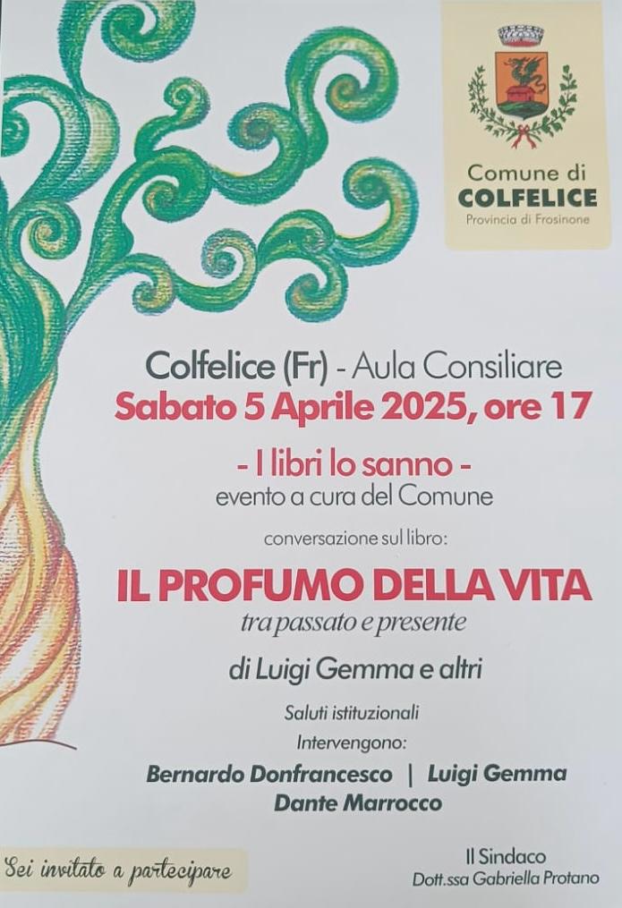 A Colfelice, sabato 5 aprile 2025, ore 17.00 , evento "I libri lo sanno" con conversazione sul libro "Il Profumo della Vita" di Luigi Gemma e altri. Interventi di Donfrancesco, Gemma e Marrocco.